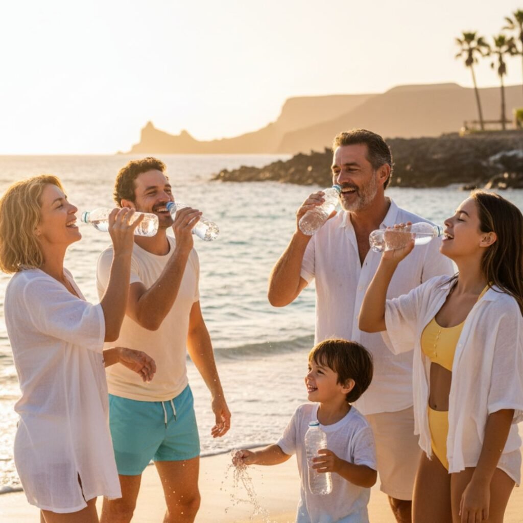 Mantente hidratado bajo el sol canario. Agua pura y refrescante para toda la familia.